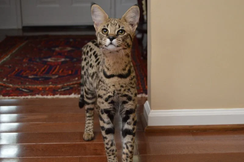 Darla is BIG and long bodied for a female. Darla is most likely the first silver cinnamon F2 Savannah to be produced. Darla is outgoing but mellow for her generation. Great with other cats and people. Will bond strongly with her chosen person. Bottle raised to be super sweet.